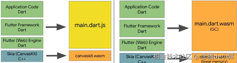 什么是 WebAssembly 的 Dart native 现在应该很好理解了吧?一直以来 Flutter 对于 WebAssembly 的支持都是:使用 Wasm 来处理CanvasKit 的 runtime,而 Dart 代码会被编译为 JS,而这对于 Dart 团队来时,其实是一个「妥协」的过渡期,而基于 WasmGC, Dart 已经开始支持直接编译为原生的 Wasm 代码。