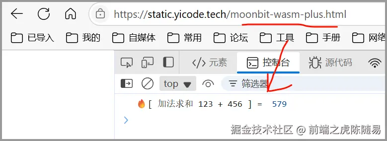 在线访问地址:https://static.yicode.tech/moonbit-wasm-plus.html,浏览器控制台看输出结果。