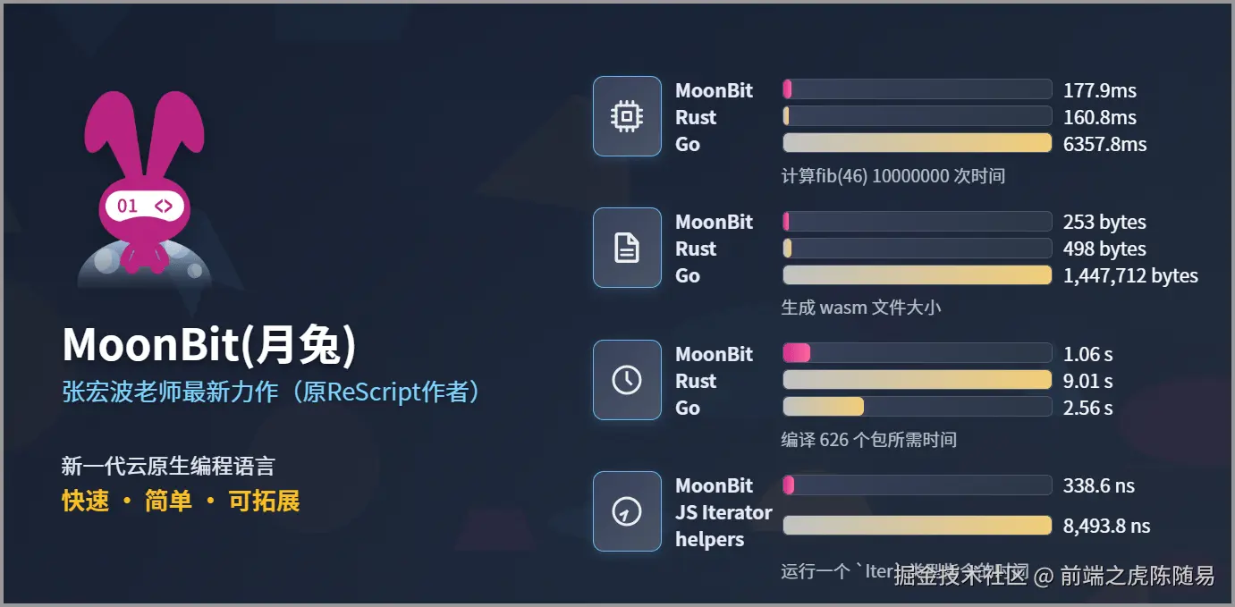 目前业界内,生成高质量的 wasm 的编程语言,非 Rust 莫属,但是呢,MoonBit 这个专门主打高质量 wasm 的编程语言,比 Rust 更强,语法也没有 Rust 那么复杂,非常适合前端,或者说是所有程序员入手。
