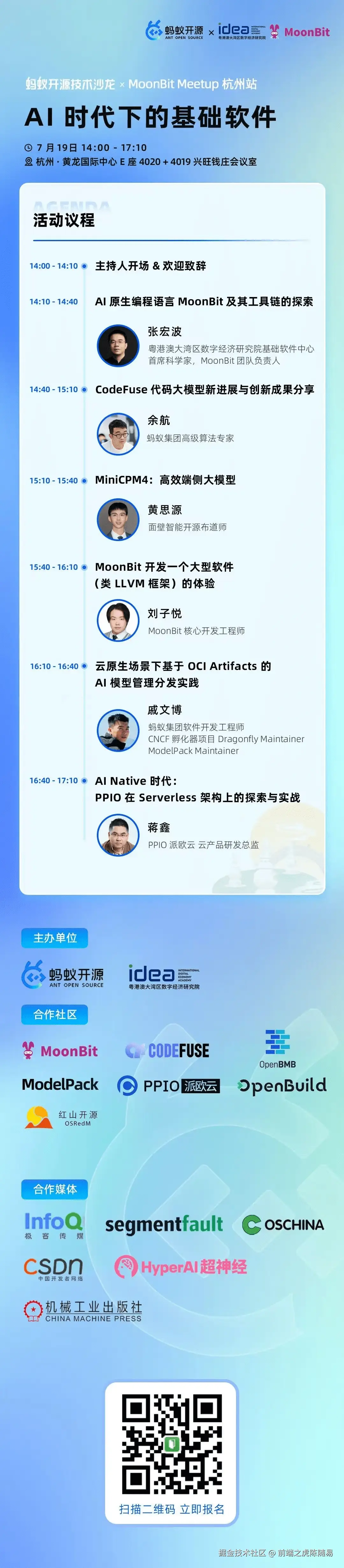 最后,MoonBit 在7月19日在杭州的黄龙国际中心有一个技术沙龙,如果大家对 MoonBit 感兴趣,可以扫描下方二维码报名参会与。