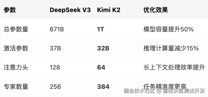 Kimi K2 采用与 DeepSeek V3 相似的MoE架构,但关键参数大幅调整:
