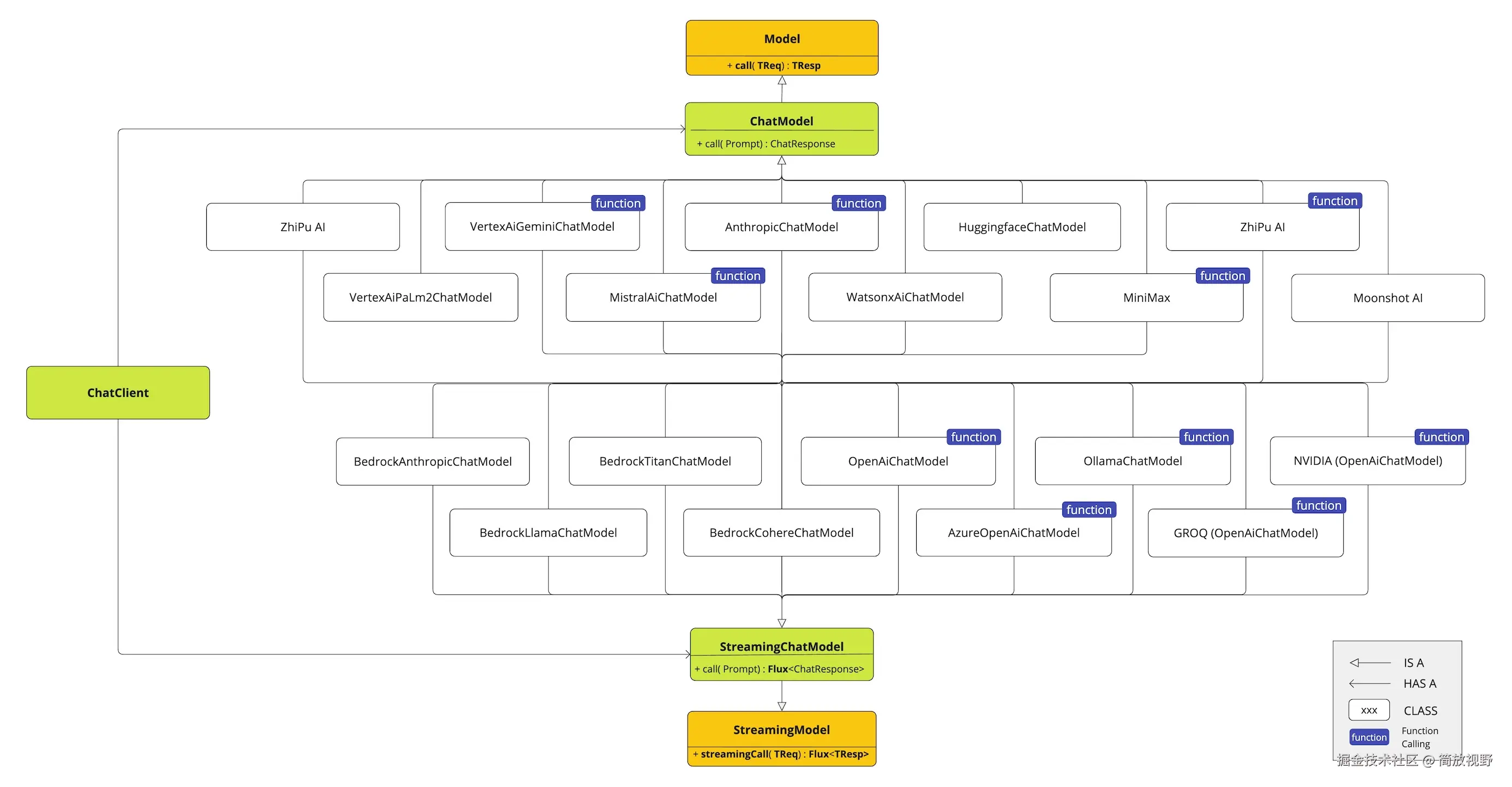 - 提供商具象:OpenAiChatModel、VertexAiGeminiChatModel、AnthropicChatModel