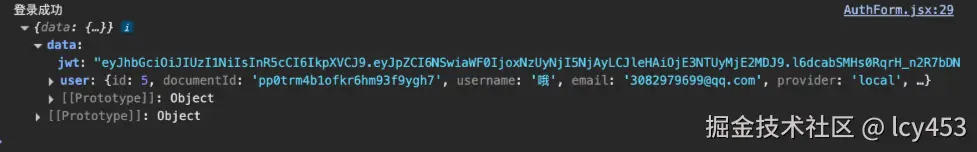 然后登录的时候就可以看到控制台成功返回了res,包含jwt以及我们的user数据。