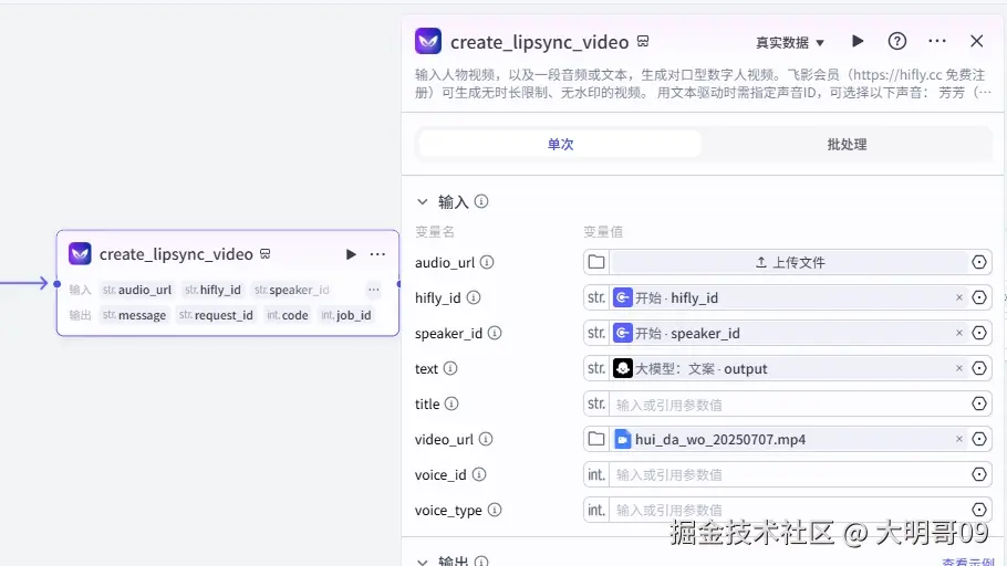 生成文案后,在利用「飞影数字人」插件调用其接口生成视频,目前大明哥选择的是「create_lipsync_video」工具:
