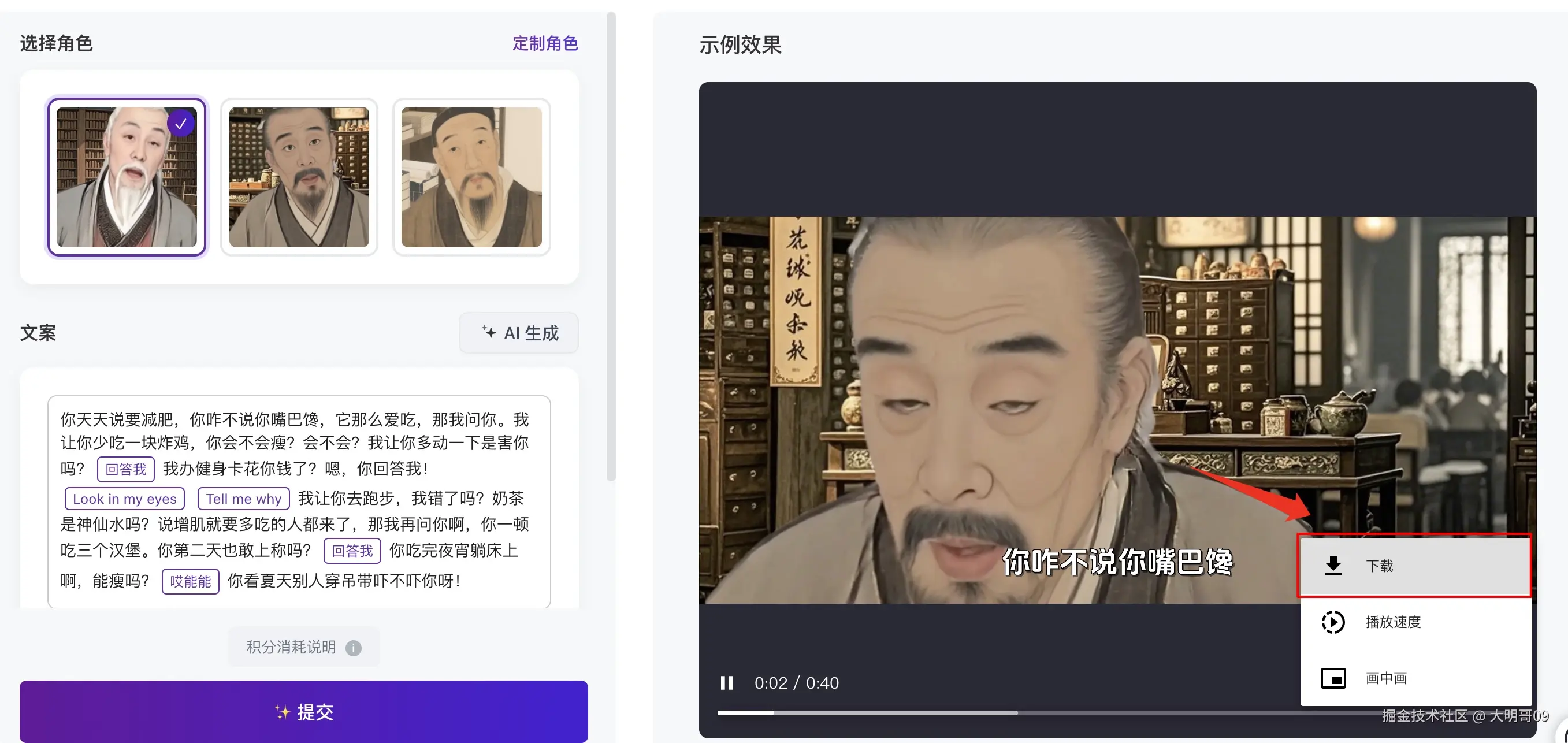 原版视频下载好了,就可以利用 Viggle 将任务形象图片和视频进行融合。