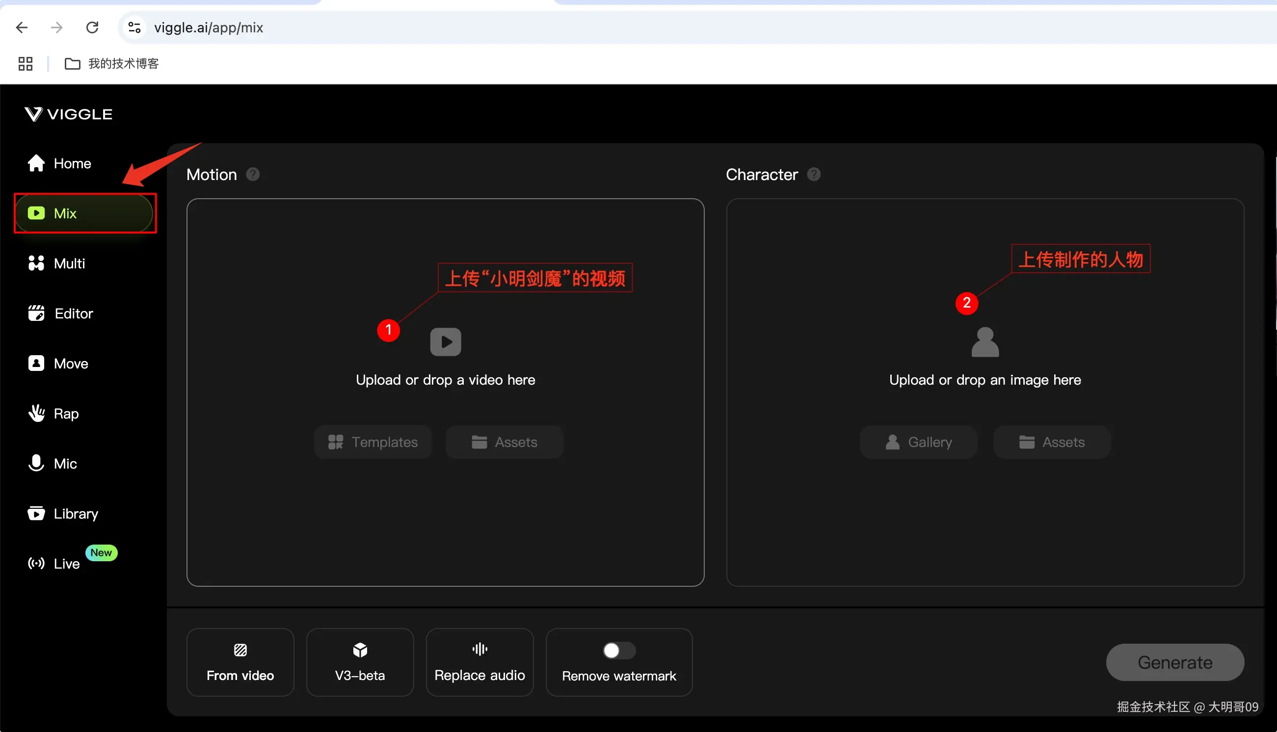 进入网站: viggle.ai(需要魔法),点击 Mix,上传“小明剑魔”视频和制作的任务图片,就可以生成一个视频了: