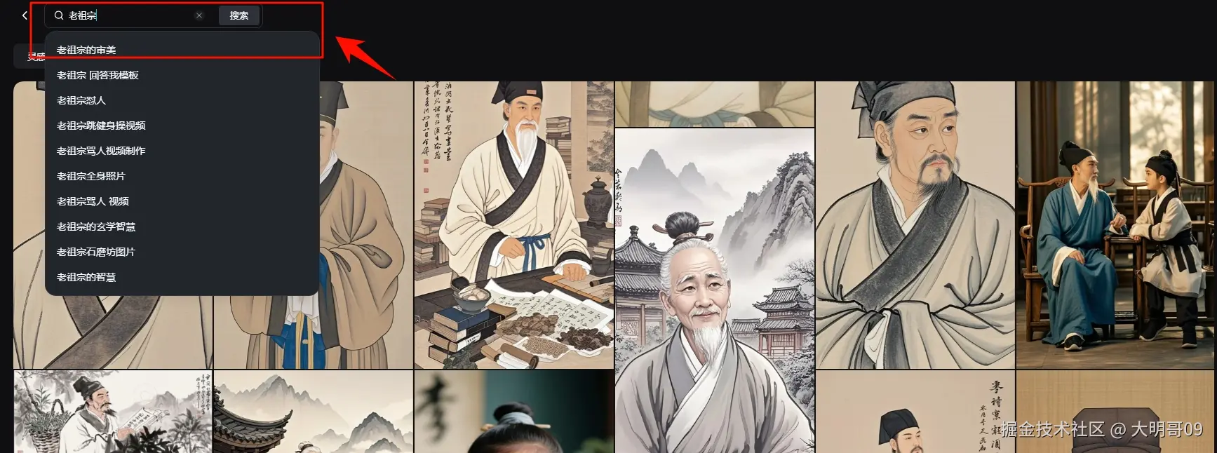 首先我们需要一张老祖宗的图像,这个可以直接到即梦里面去找风格类似的图像,然后简单修改下提示词,在即梦里面运行下就可以了。比如直接输入“老祖宗”,找到一个合适的照片: