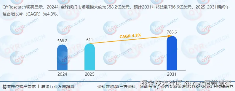 阀门作为流体控制系统的核心组件,通过调节通道开闭或阻塞程度,精准控制液体、气体等介质的流动方向、压力及流量。其技术特性涵盖密封性、耐腐蚀性及耐压性,直接决定工业流程的安全性与效率。全球阀门市场覆盖石油天然气、水处理、电力、化工等关键领域,根据QYResearch最新调研报告显示,2024年市场规模达588.2亿美元,预计2031年将增至786.6亿美元,2025-2031年复合增长率(CAGR)为4.3%。这一增长受工业扩张、基础设施升级及技术迭代驱动,尤其在亚太和中东地区,工业基础强化与新兴经济体崛起成为核心动能。
