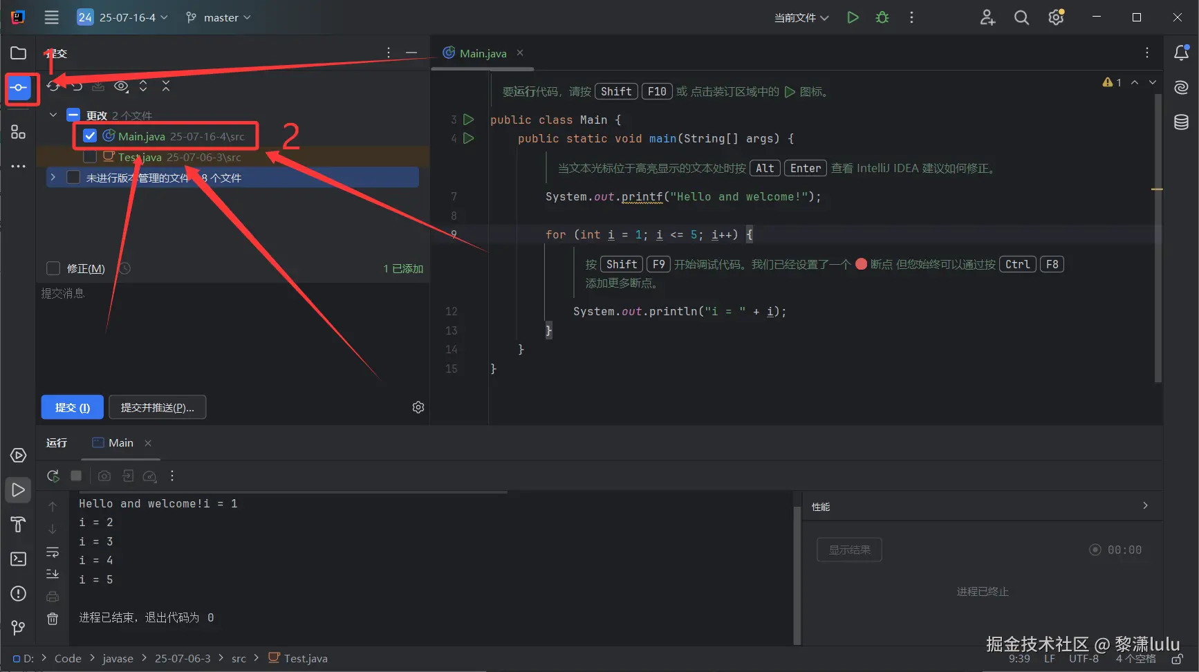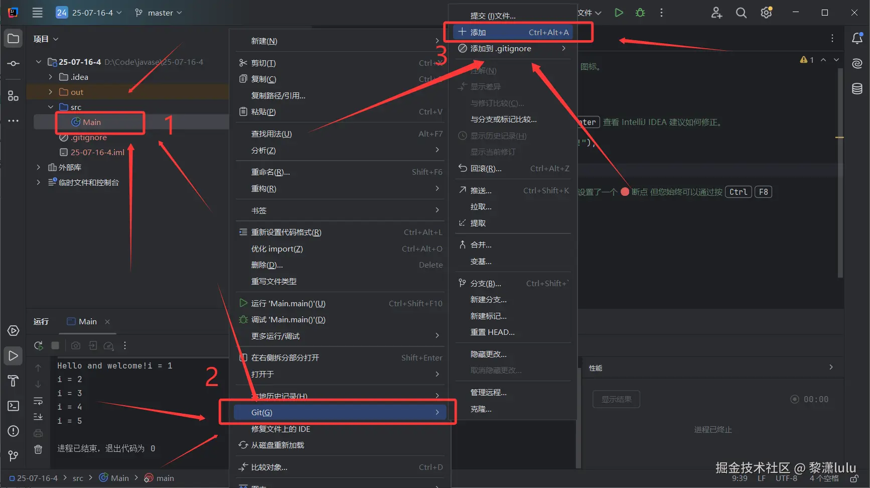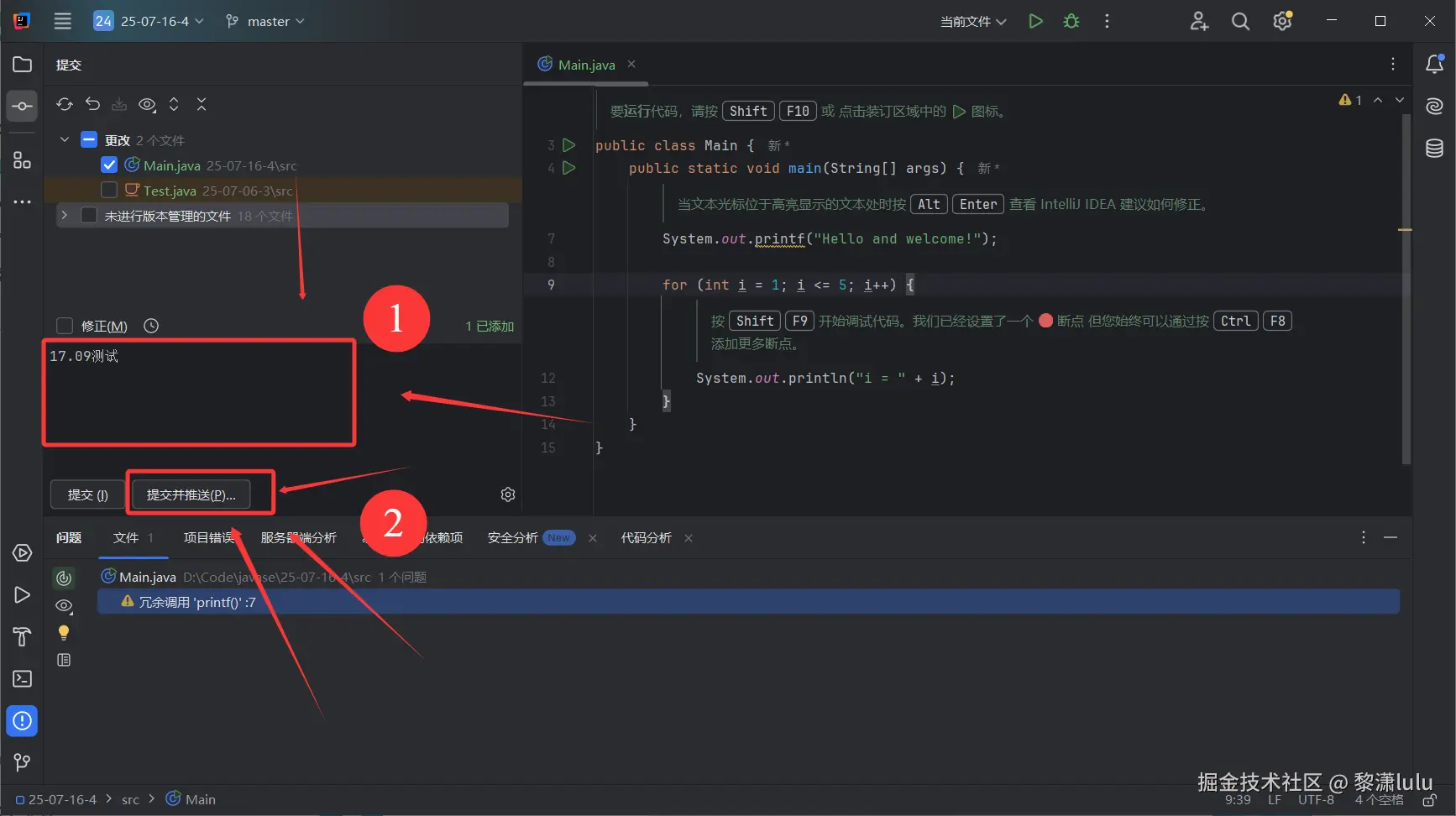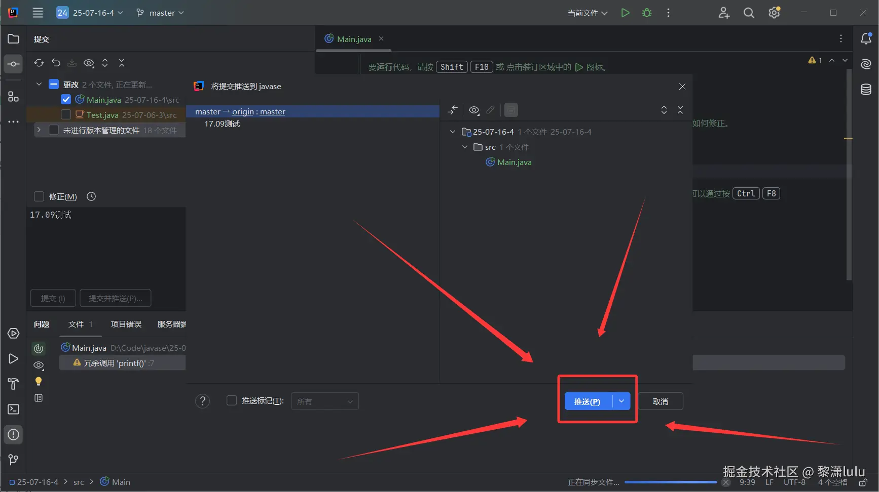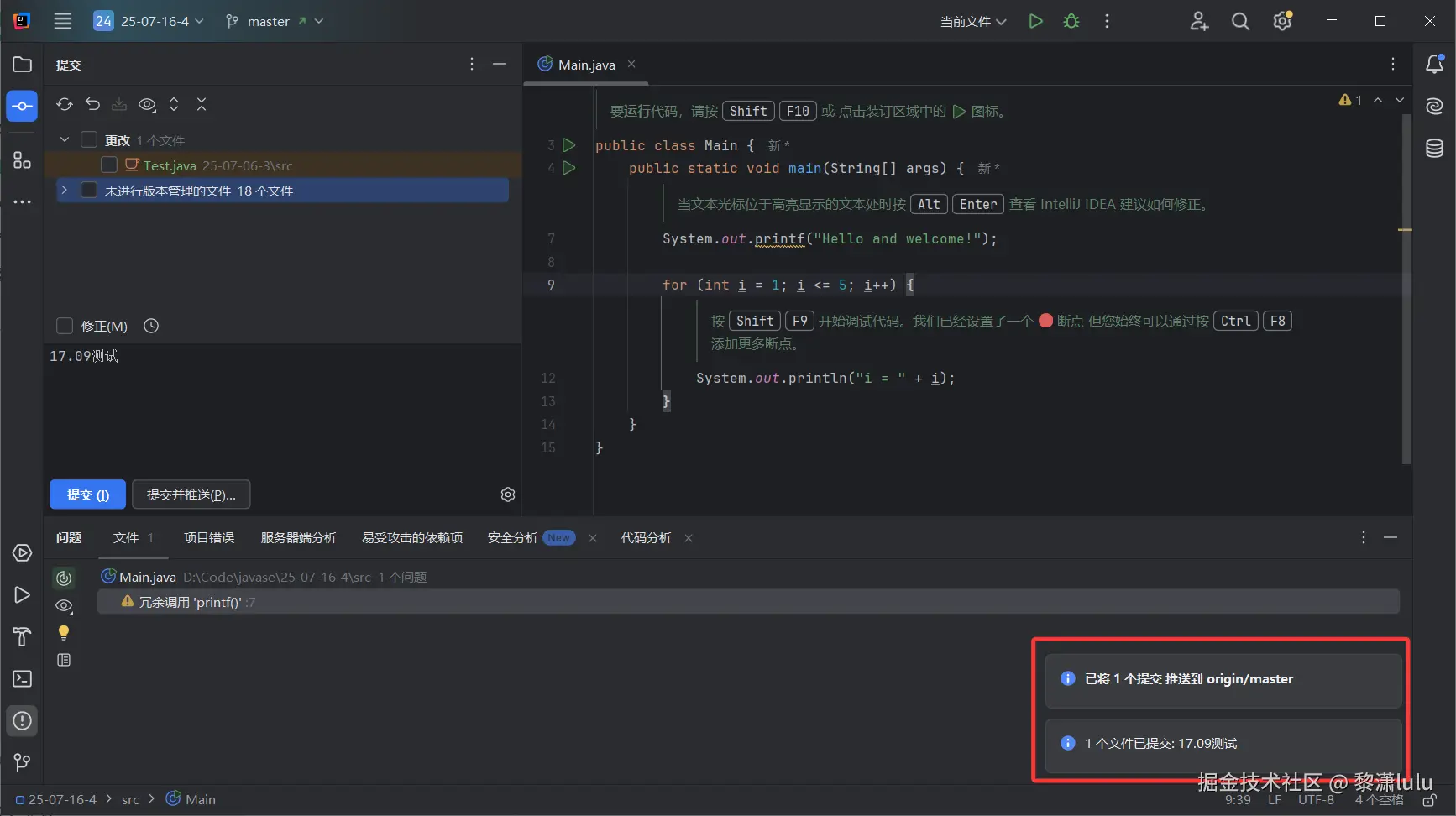 JavaSE IDEA的Git使用方法(中文IDEA版) 黎潇lulu 2025-07-16 57 阅读1分钟 第一步:右键Main文件,点击Git,点击添加 第二步:点击Git,点击刚刚添加的文件 第三步:撰写提交信息,提交并推送 第四步:点击推送 显示推送完成 去码云看一下有没有推送成功: 成功提交,且只提交了代码,其他的冗余配置文件均未上传,对云端仓库比较友好 感谢阅读