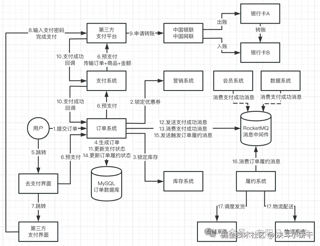 订单正向链路有三个核心环节:生成订单 + 支付 + 履约。