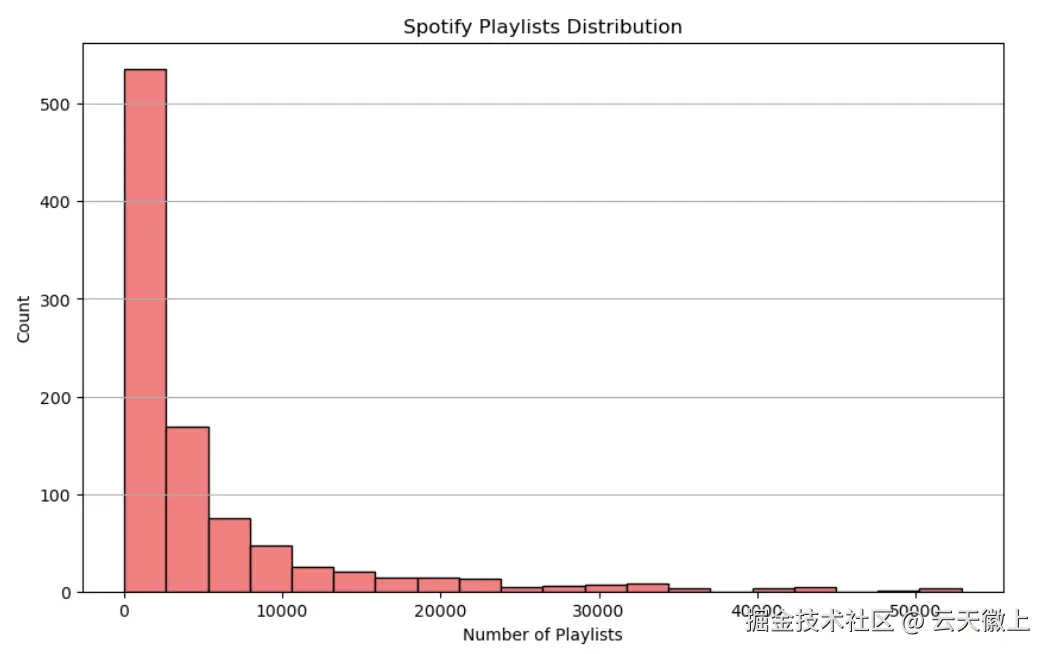 - 歌曲在Spotify播放列表中的分布:少数歌曲被大量播放列表收录,表明其受欢迎程度。