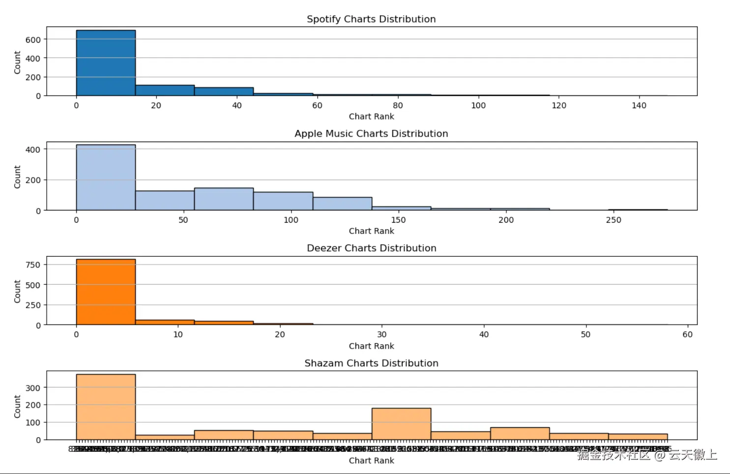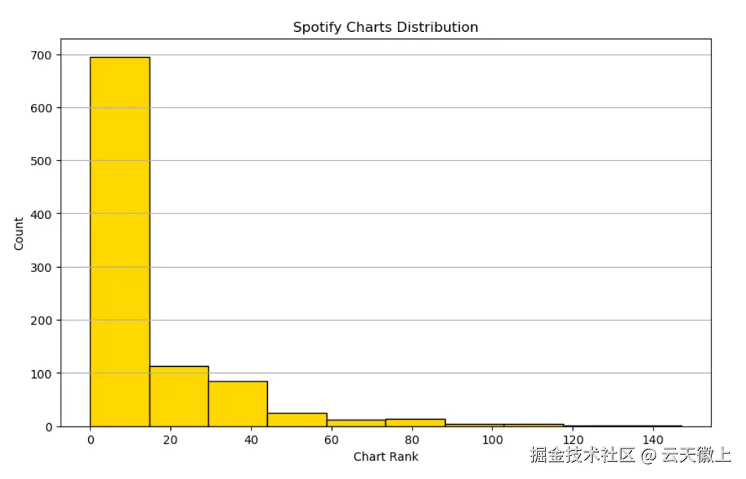 - 歌曲在Spotify排行榜中的分布:排名靠前的歌曲数量较少,头部效应明显。