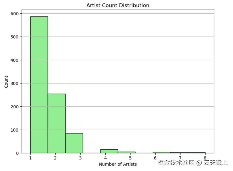 - 艺术家数量分布:大多数歌曲由单个或少数几个艺术家合作完成。