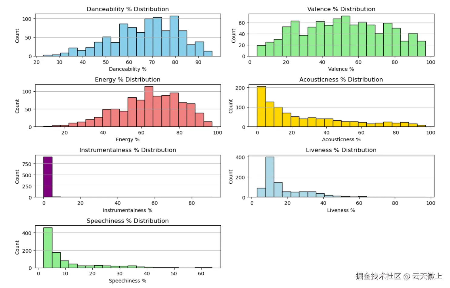 - instrumentalness_% :歌曲中的器乐内容的百分比