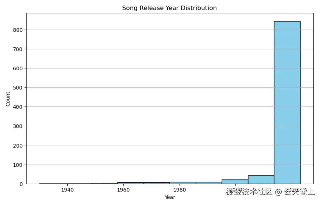 - 歌曲发行年份分布:歌曲发行年份集中在近几年,反映了数据集的时效性。