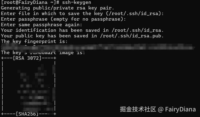 执行命令后,通常会询问密钥保存路径和密码短语,一路按回车 选择默认路径并跳过设置密码短语即可