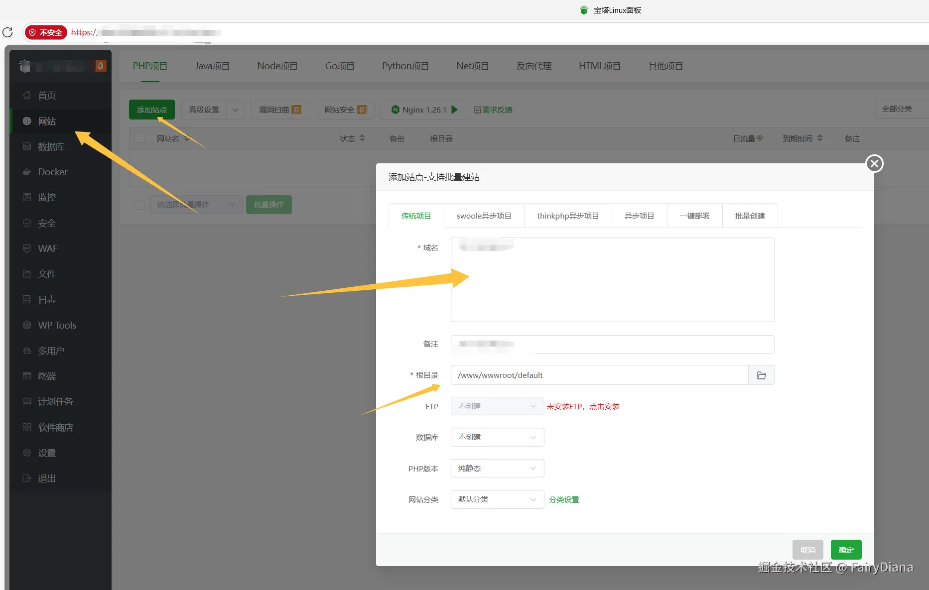 然后创建一个站点,域名填服务器 IP 就行
