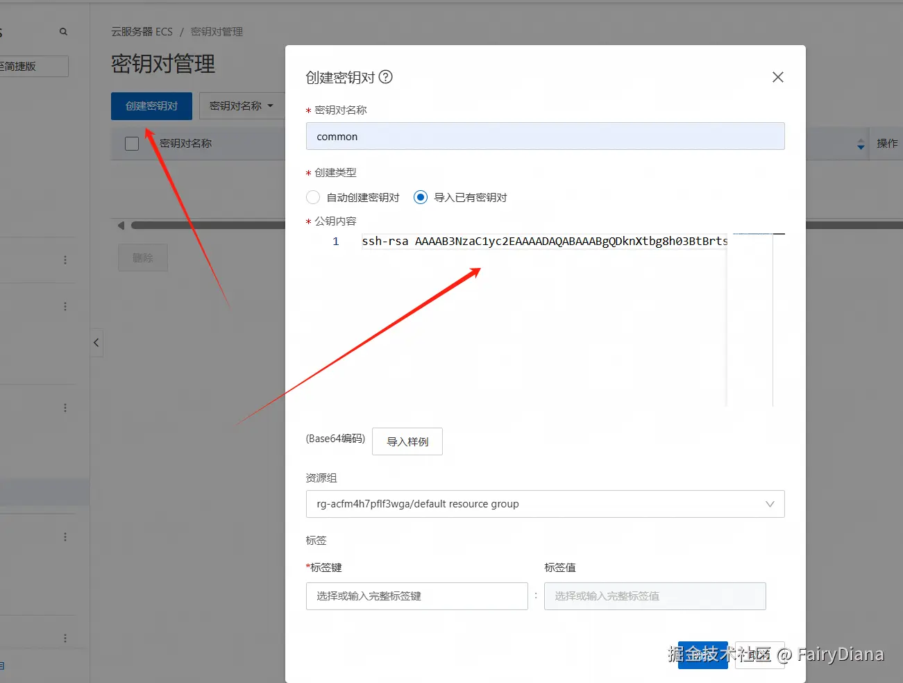 为了方便管理,你也可以在阿里云上绑定你的密钥对。搜索密钥对管理,将你的公钥导入。