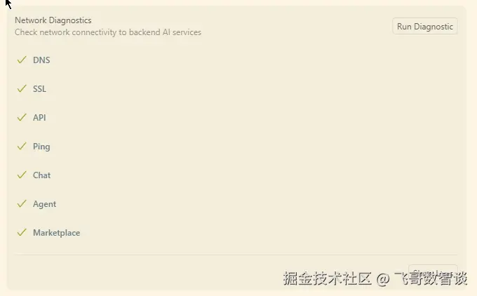点击“Run Diagnostic”,如果所有项检测通过,那 AI Chat 一般就没什么问题了。