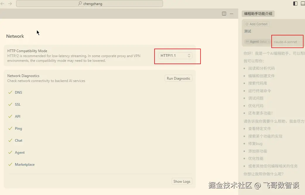 在 Cursor 的 Settings 中,找到 Network 选项卡,设置 HTTP Compatibility Mode 为 HTTP/1.1。
