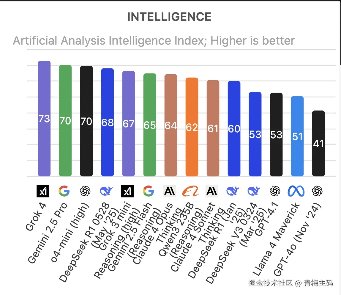 在智力能力评估中,xAI 公司的最新出炉的 Grok4 大模型冲到了第一名,表现最为出色,智力指数达到73分,紧随其后的是 Gemini 2.5 Pro和o4-mini,均获得 70 分的高分。值得注意的是,DeepSeek-R1 也以 68 分的成绩跻身前列,展现出中国 AI 技术的快速发展。