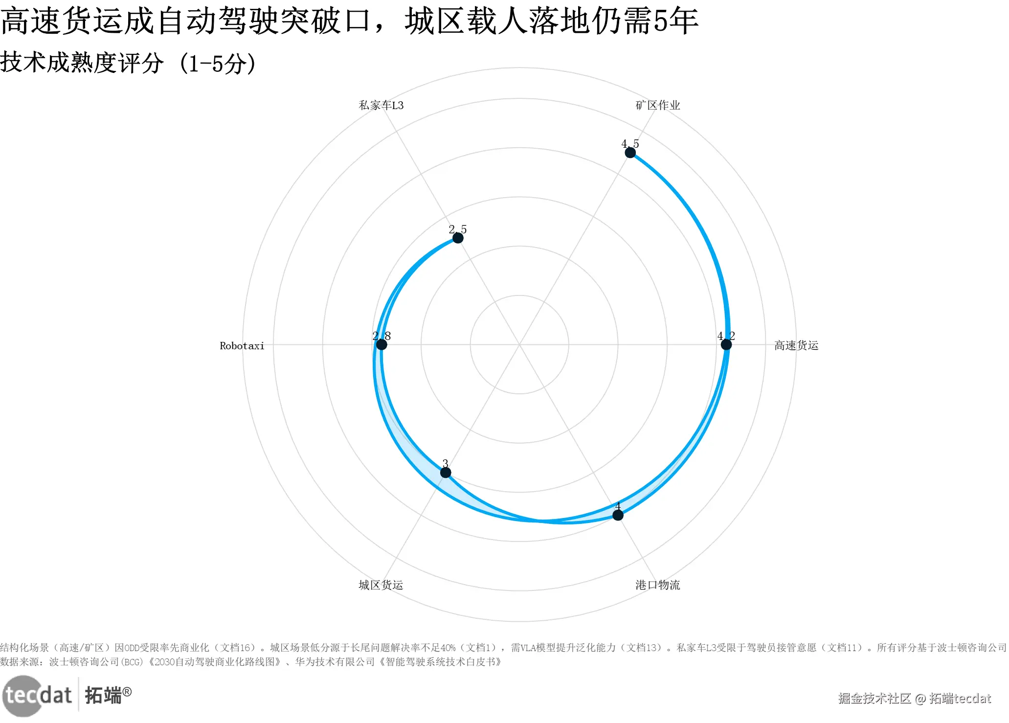 到了2025年,卡车高速L4的成熟度达到4.5分,率先实现突破。这是因为高速公路场景结构化程度高,车道线清晰、交通流稳定,算法更容易处理。反观城区Robotaxi,由于要应对行人横穿马路、突发交通事故等各种难以预测的情况,成熟度只有3.2分,要实现大规模落地估计还得等5年以上。