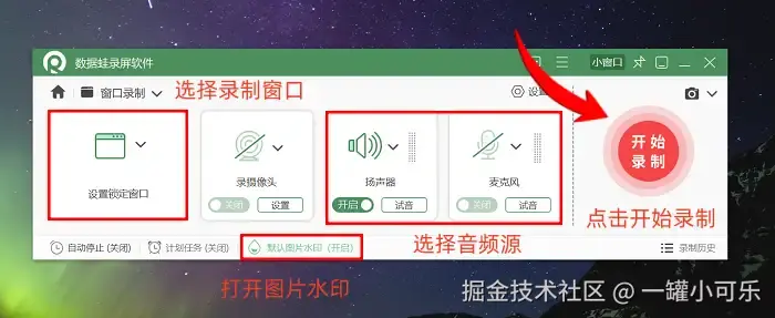步骤2:在录制设置阶段,可以灵活调整录制范围(支持全屏/区域选择),音频输入可选择仅系统声、仅麦克风或两者同步录制。还可以在 “图片水印” 设置中上传水印图片文件。确认所有参数后,点击界面右侧的红色圆形按钮就可以开始录制啦。