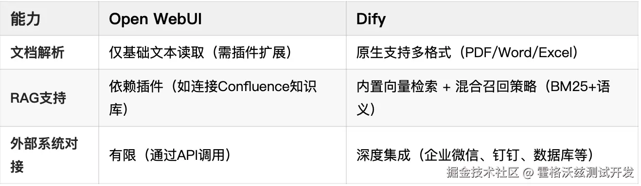 📌 关键差异:Dify 提供 端到端RAG流水线(上传→切块→检索→生成),而 Open WebUI 需额外工具链支持。