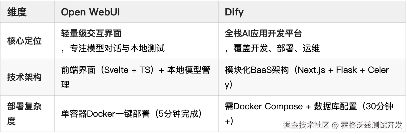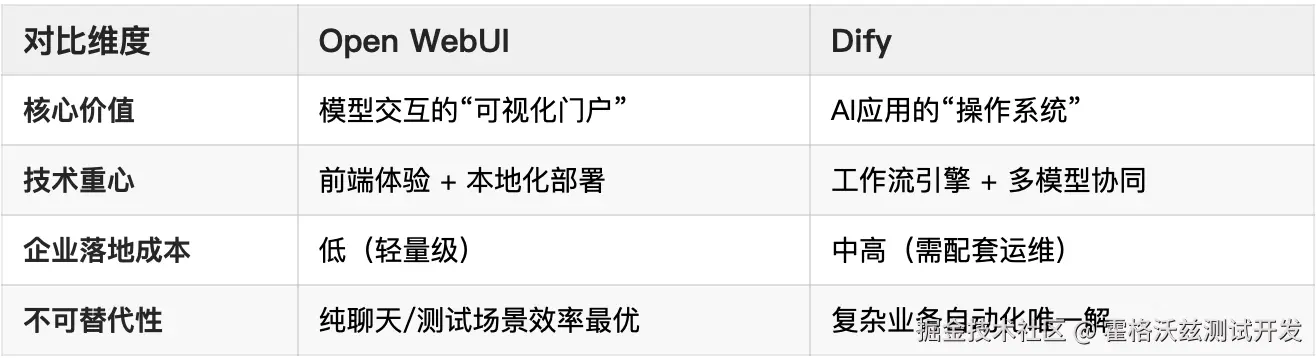 在企业AI应用的构建过程中,Open WebUI 和 Dify 作为两大主流开源工具,定位和功能差异显著。以下是基于技术架构、适用场景和核心能力的深度对比分析: