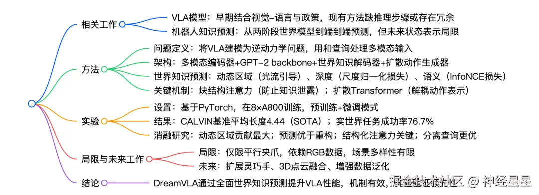 本文提出了一种名为 DreamVLA 的新颖 VLA 框架,该框架通过整合全面的世界知识预测来实现逆动力学建模,从而为操作任务建立了感知-预测-行动循环。具体而言,DreamVLA 引入了一种动态区域引导的世界知识预测方法,结合了空间和语义线索,为动作规划提供了紧凑而全面的表示。这一设计与人类与世界互动的方式相一致,即首先形成抽象的多模态推理链再采取行动。