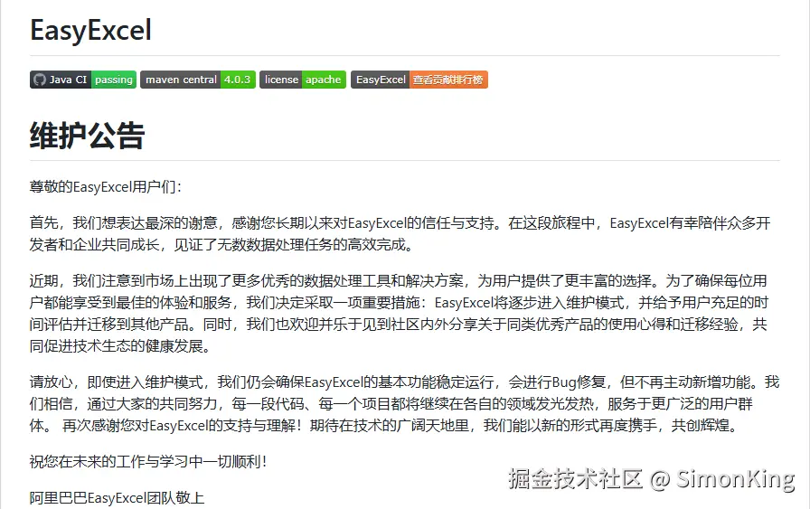 FastExcel是EasyExcel版本的延续,自从阿里巴巴官方停止维护EasyExcel,EasyExcel的作者继续维护起来,并持续改进优化,并更名为FastExcel。