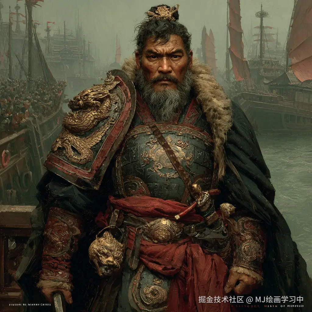 AI绘画生成孙权全身像优化的中文提示词,结合历史形象与艺术表现力,突出其帝王气质与武将风范: