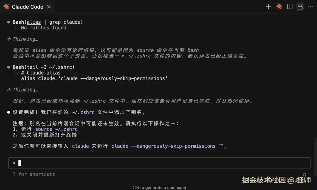 考虑到每次都输入 claude --dangerously-skip-permissions 太麻烦了,你可以建一个 alias。