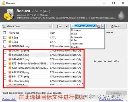 除了数据 蛙恢复专家,还有Recuva可供大家进行对比选择。Recuva是免费的数据恢复工具,它所占的电脑内存也很小,仅有2MB。但这款硬盘数据恢复软件开发的时间较早,页面设计比较老旧,而且扫描文件未能提供预览功能,可能需要用户根据一些零碎的信息来选择自己需要恢复的文件。