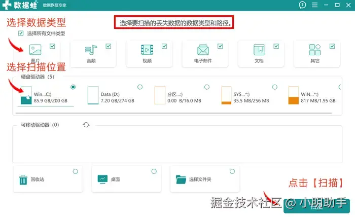 步骤1: 进入到软件首页后,我们可以根据自己的意愿选择需要扫描的数据类型(有文档、图片、视频、音频、电子邮件供我们选择),再选择丢失数据的位置,然后才能开始进行扫描;