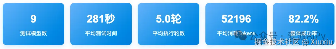 基于成功率(80%)、Tokens消耗(10%)、时间效率(5%)和执行轮数(5%)四个维度的综合评分。结果显示: