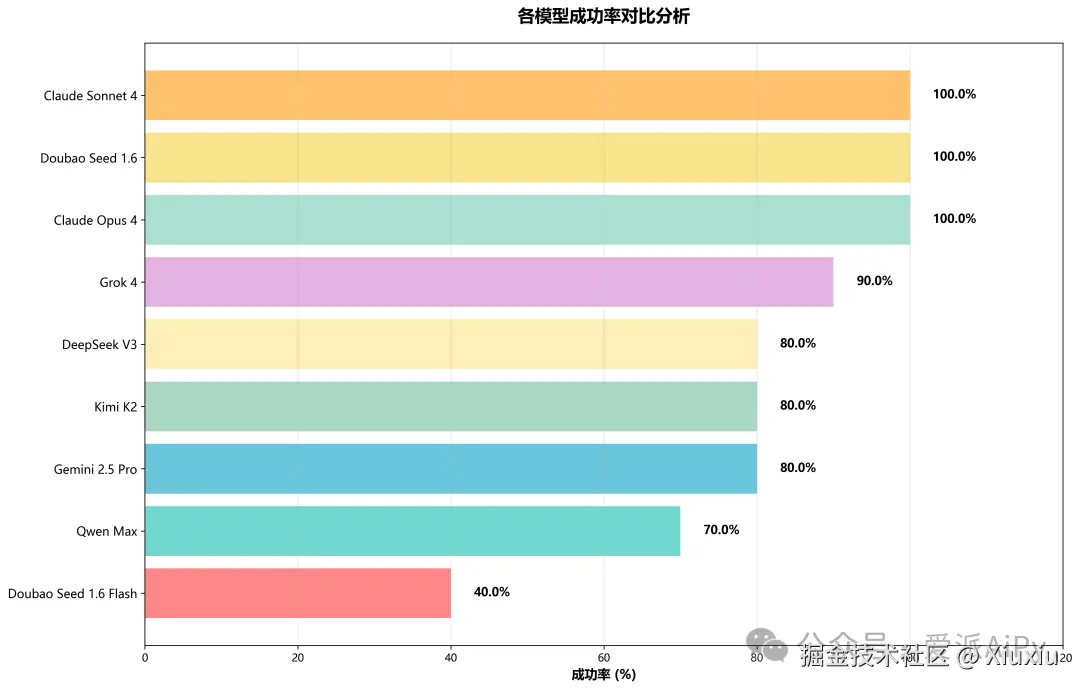本次测评整体成功率达到82.2%,新增模型的加入使得平均水平略有上涨,头部模型依然保持100%成功率,展现了技术领先优势。国产模型在追赶过程中表现出强劲的发展势头。