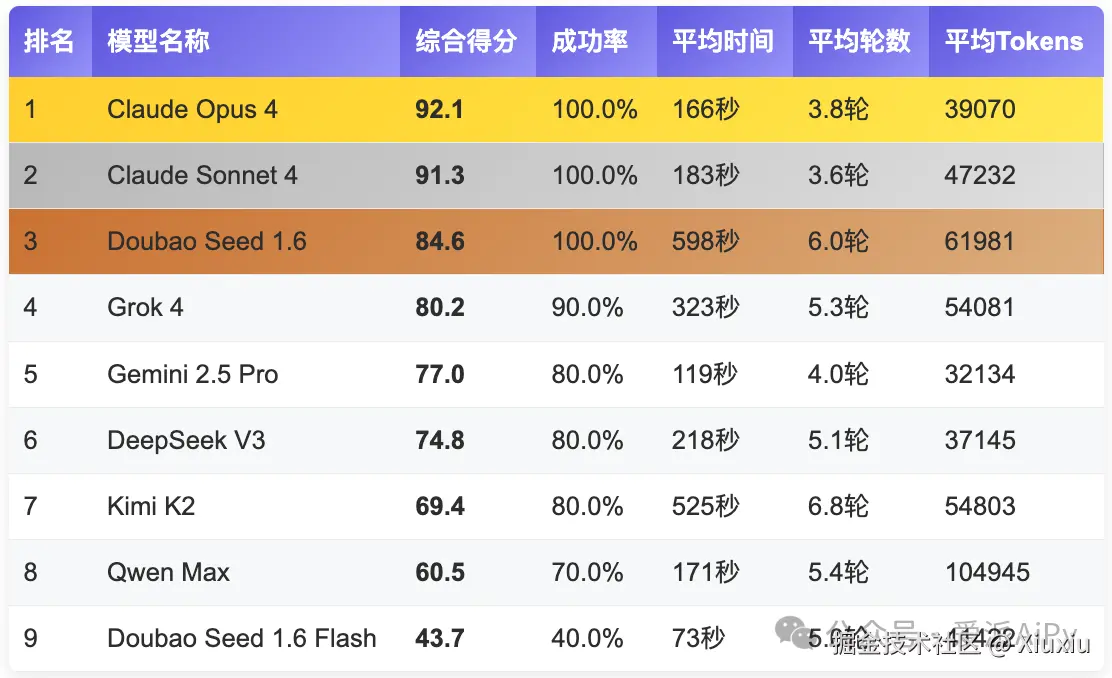 Claude Opus 4以92.1分的综合得分稳居榜首,其100%的完美成功率和最优的执行轮数控制(3.8轮)展现了Anthropic在大模型技术方面的深厚积淀。特别在系统分析和复杂推理任务上,表现出了超越其它模型的理解能力和执行精度。