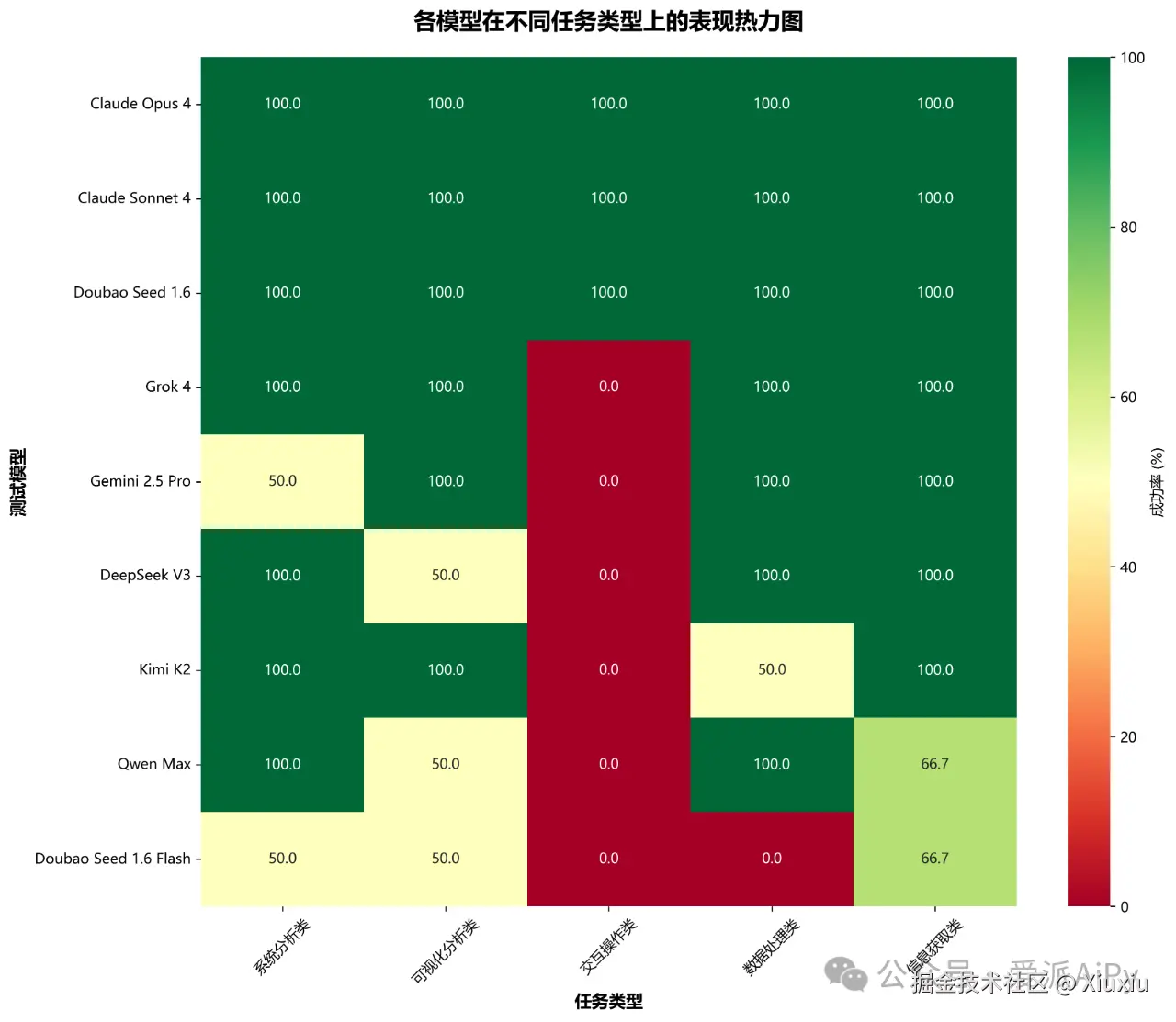 不同类型任务对模型能力的要求各异,热力图清晰展示了各模型的专业领域优势: