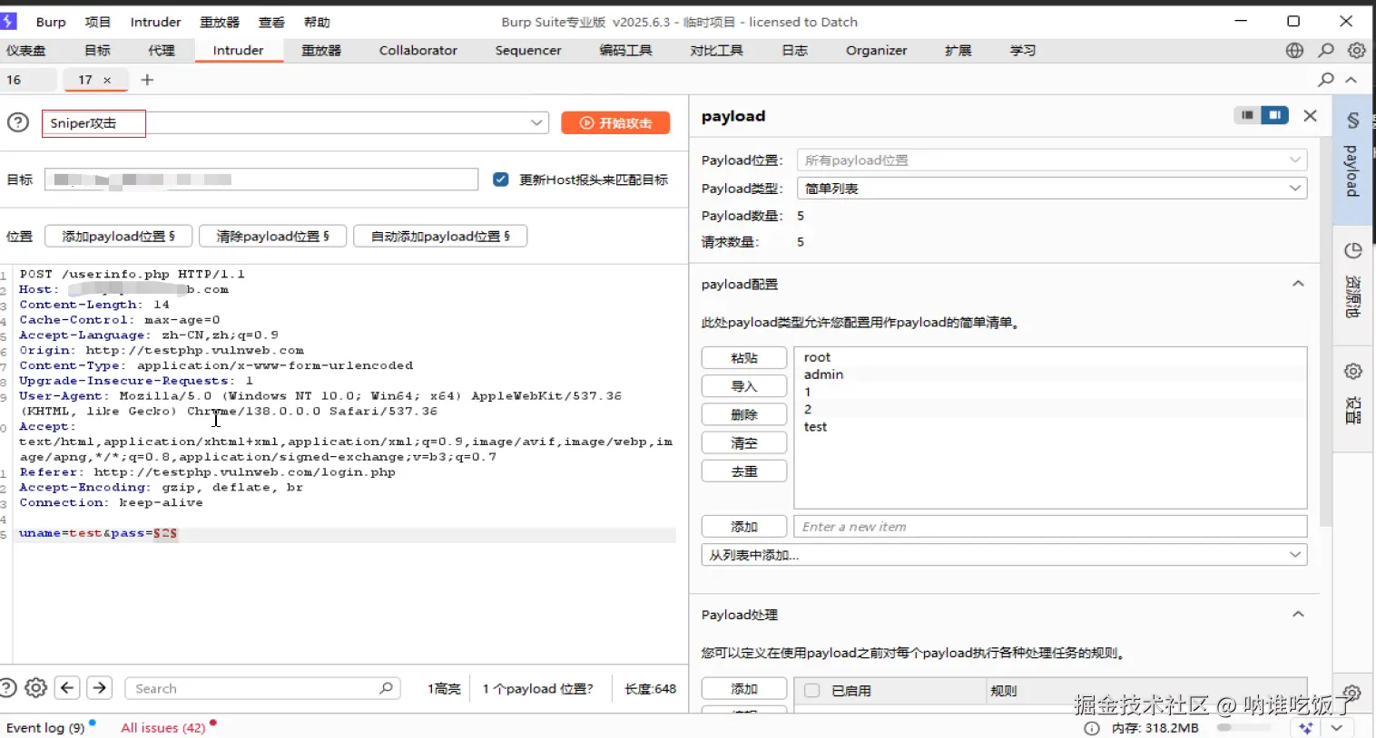 2、Intruder模块:可以进行暴力破解。将通过代理抓取的数据包发送到该模块,进行暴力破解、payload管理等。
