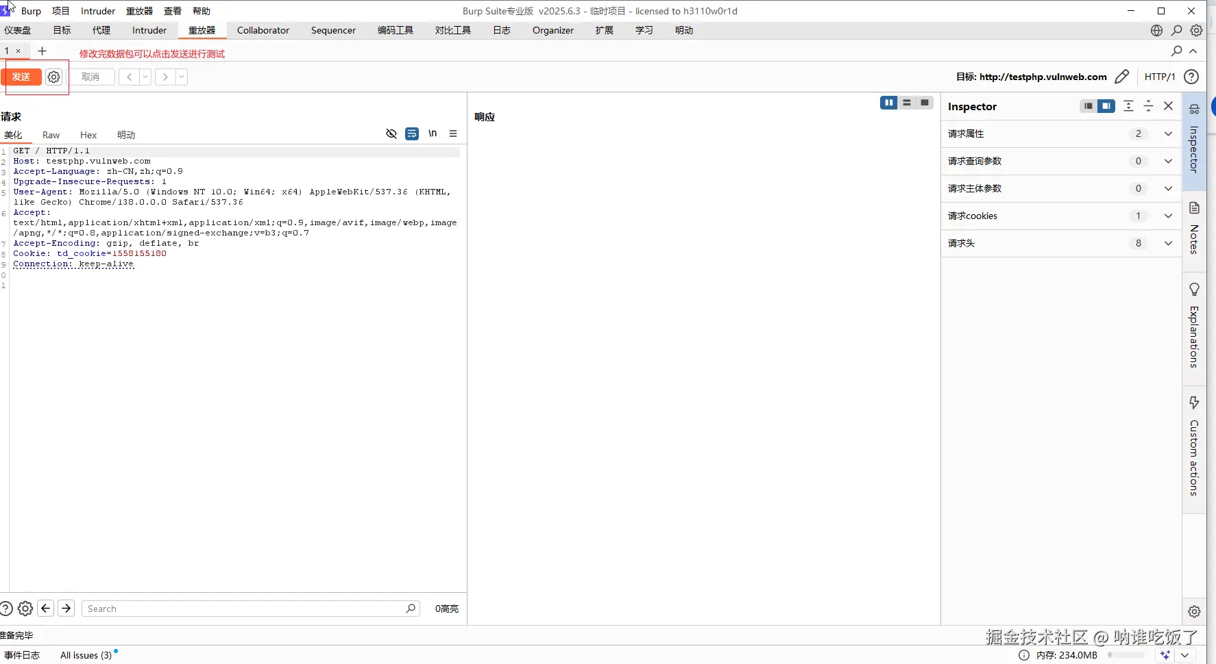3、Repeater模块:手动修改http/https请求报文。将代理模块抓到的请求报文发送到Repeater模板后可以修改数据包。