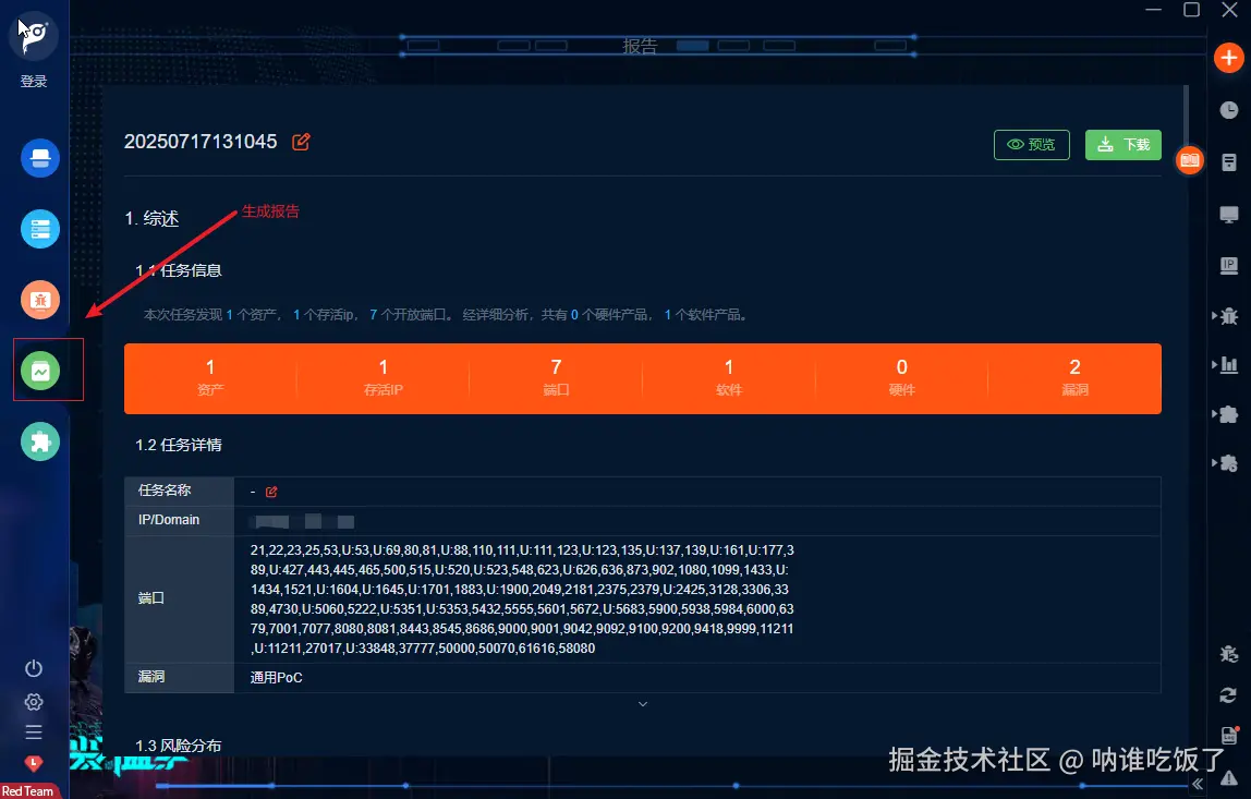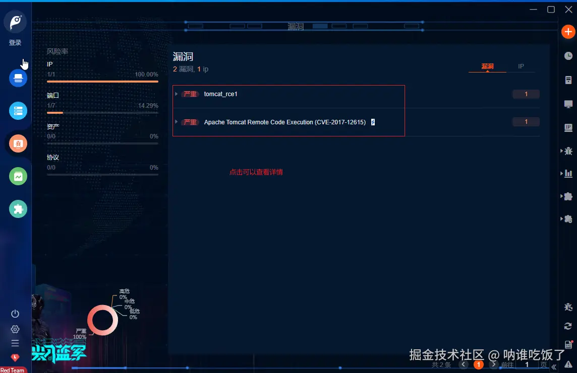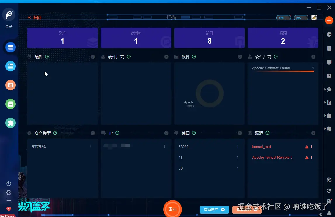 - 扫描完成,会显示资产、漏洞等信息。点击即可查看详情。