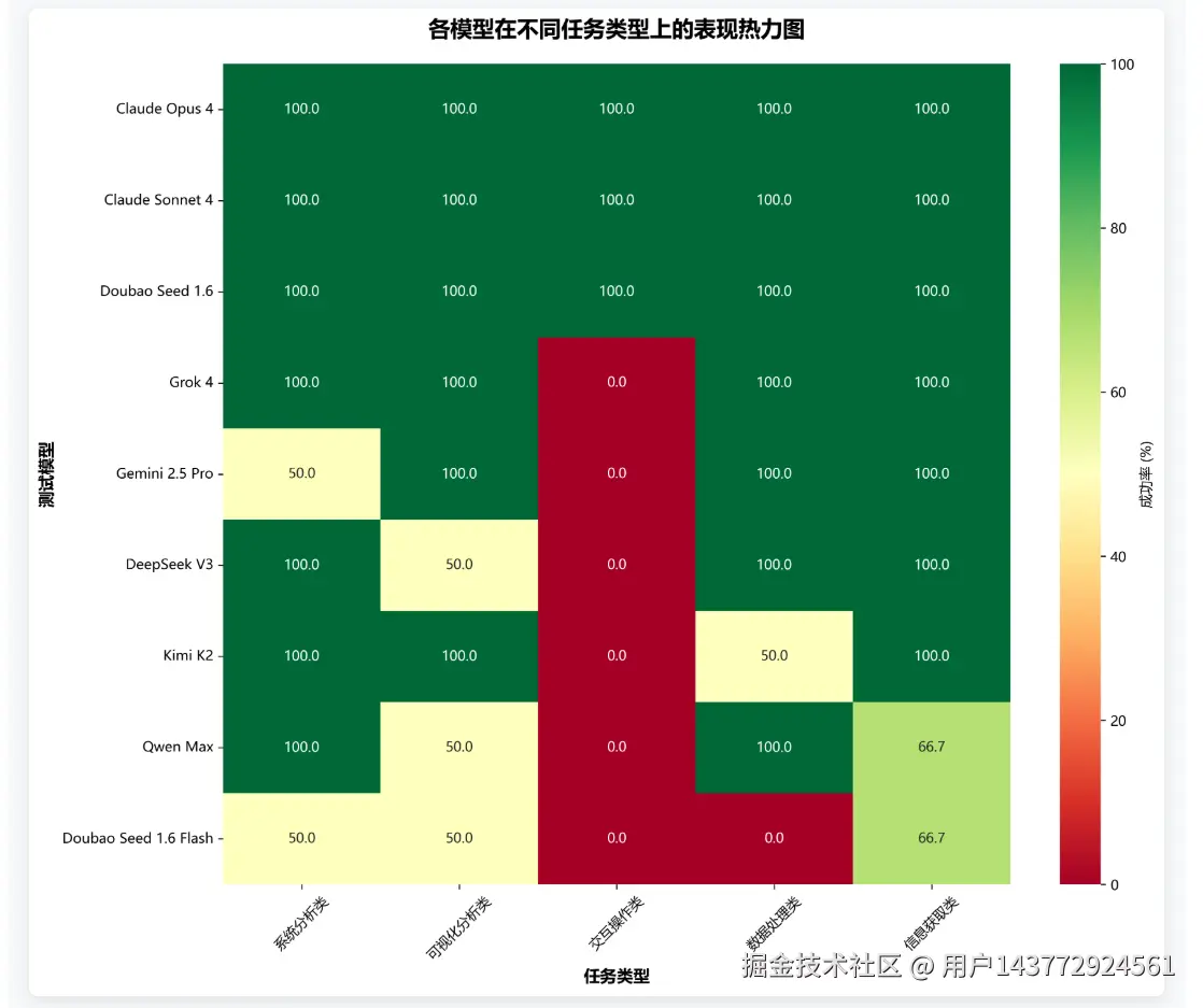 不同类型任务对模型能力的要求各异,热力图清晰展示了各模型的专业领域优势。Claude系列和Double Seed 1.6在综合能力上表现卓越,Grok系列在系统分析、可视化分析、数据处理和信息获取方面均表现良好,Gemini更擅长可视化分析、数据处理和信息获取任务,Kimi K2更擅长系统分析、可视化分析和信息获取类任务。交互操作类是本地智能体最看重的能力,仅Claude系列和Doubao Seed 1.6经受住挑战。
