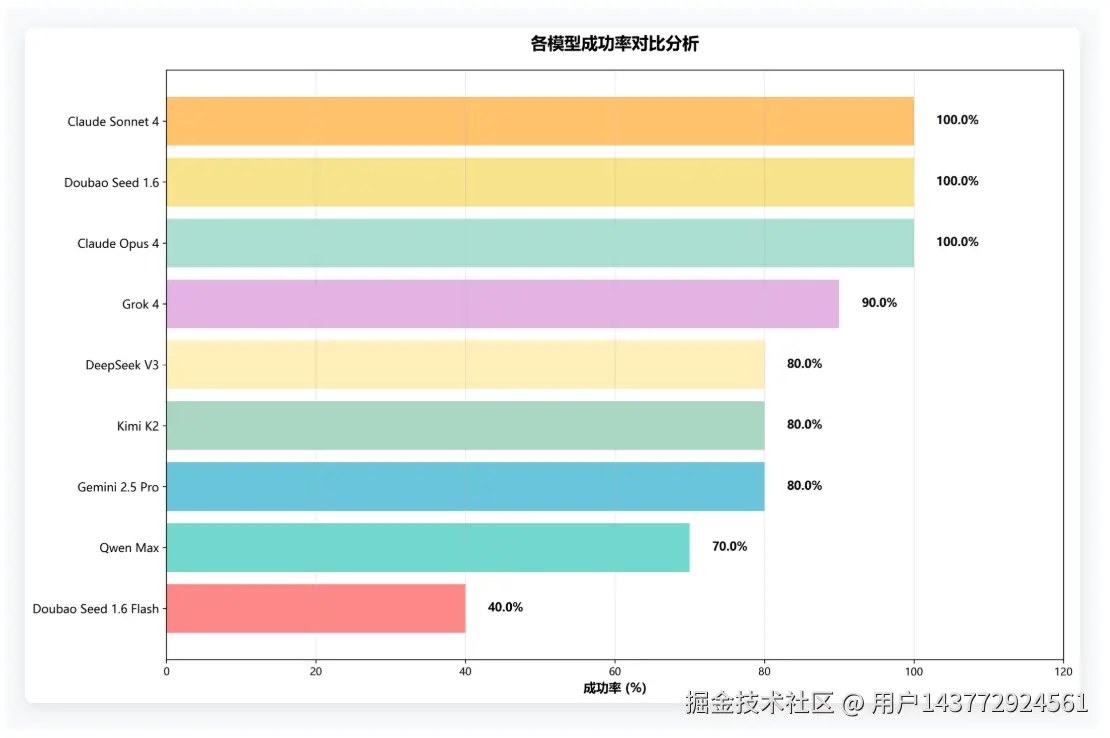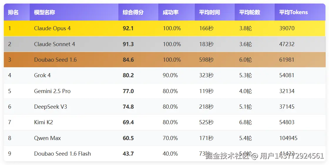 基于成功率(80%)、Tokens消耗(10%)、时间效率(5%)和执行轮数(5%)四个维度的综合评分,Claude Opus 4以卓越的92.1分夺得桂冠,展现了Anthropic在大模型领域的技术实力。紧随其后的Claude Sonnet 4和Doubao Seed 1.6分别以91.3分和84.6分占据亚军和季军位置。