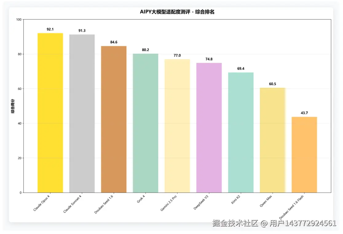 1、Claude系列确立技术领先地位:Claude Opus 4和Claude Sonnet 4分别以92.1分和91.3分占据前两名,展现了Anthropic在大模型领域的技术实力