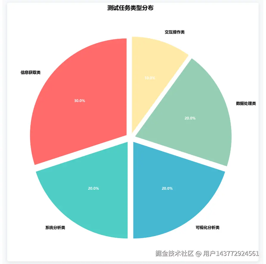 为确保测评的全面性和公平性,本次测试精心设计了涵盖五大应用场景的标准任务集。信息获取类任务占比最高(30%),反映了用户对智能搜索和知识查询的强烈需求。系统分析、可视化分析、数据处理类任务各占20%,体现了AI在专业工作场景中的重要作用。
