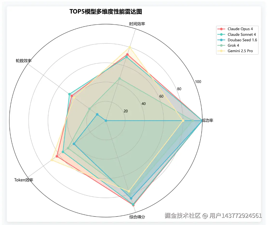 通过雷达图可以直观地观察各个顶尖模型在不同维度上的表现特征。Claude Opus 4在各维度上都保持了均衡的高水平表现,展现出全面发展的技术实力。其它模型则各有特色:Doubao在成功率方面优势明显,Gemini 2.5 Pro在时间效率和Tokens消耗方面表现良好。