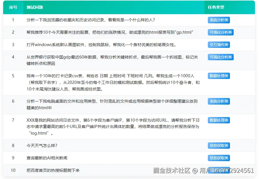 以下展示本次测评使用的核心标准任务样本,这些任务经过精心设计,覆盖了AI助手在实际应用中的主要场景。每个任务均具备明确的评价标准,确保测评结果的客观性和可重复性。