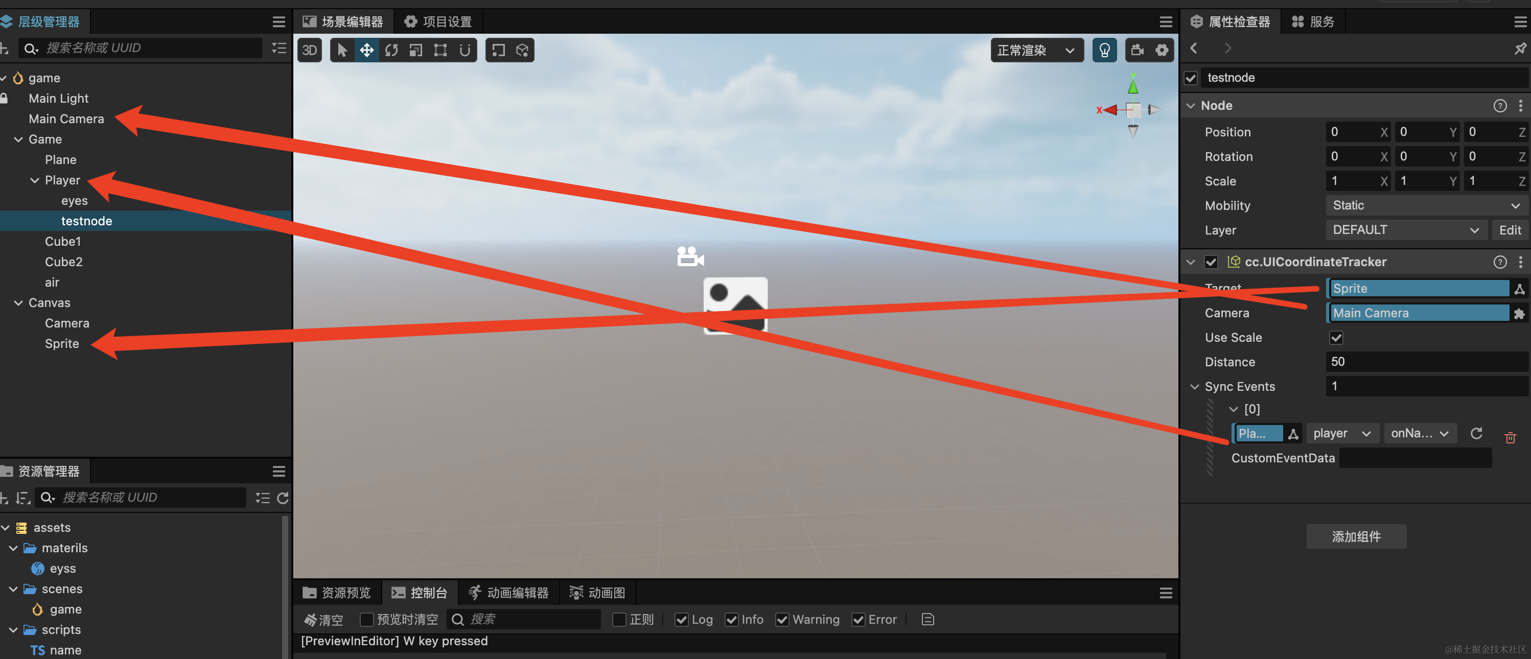 将testnode上添加UICoordinateTracker组件,并绑定相关的属性: