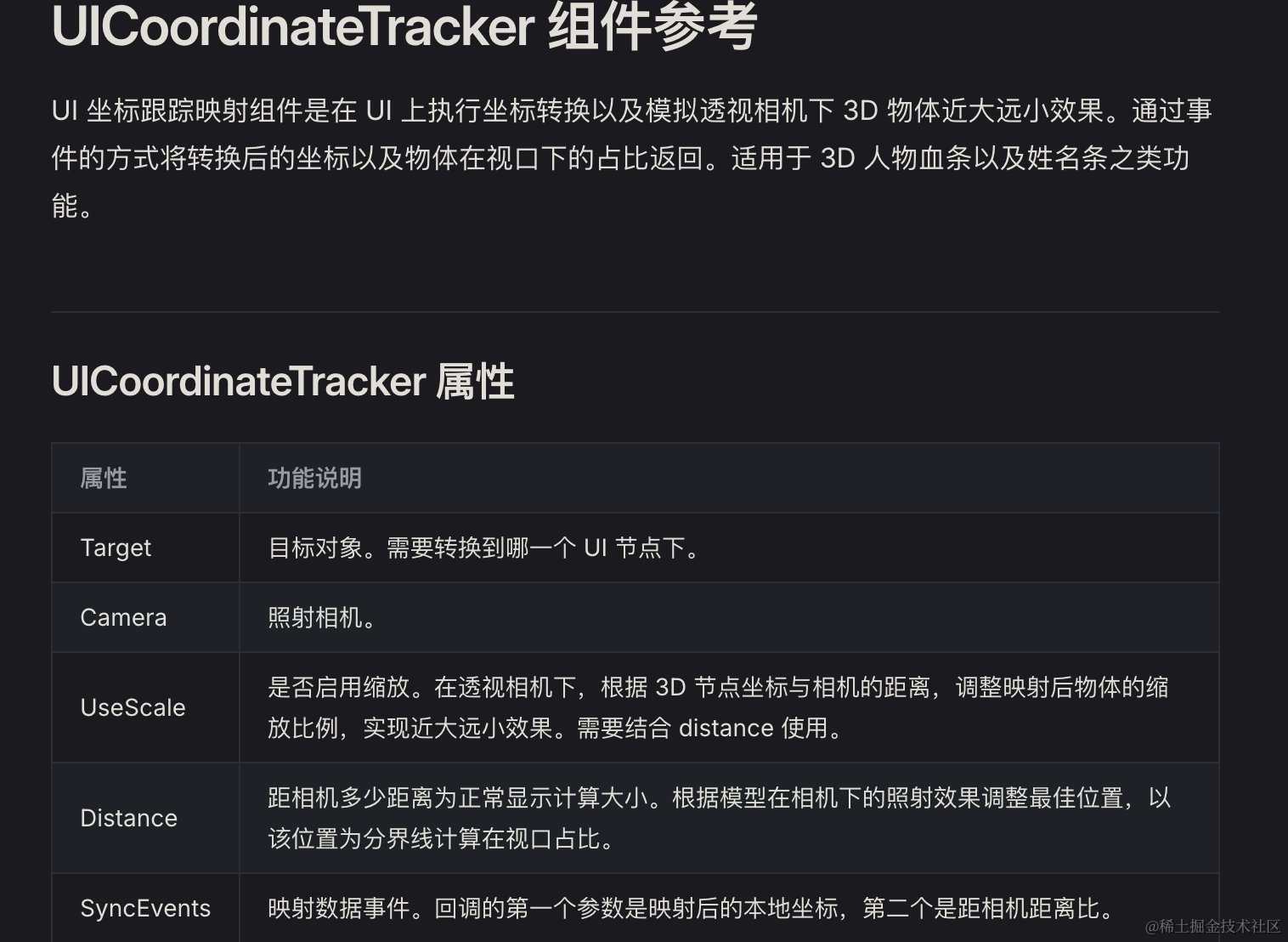 UI 坐标跟踪映射组件是在 UI 上执行坐标转换以及模拟透视相机下 3D 物体近大远小效果。通过事件的方式将转换后的坐标以及物体在视口下的占比返回。适用于 3D 人物血条以及姓名条之类功能。